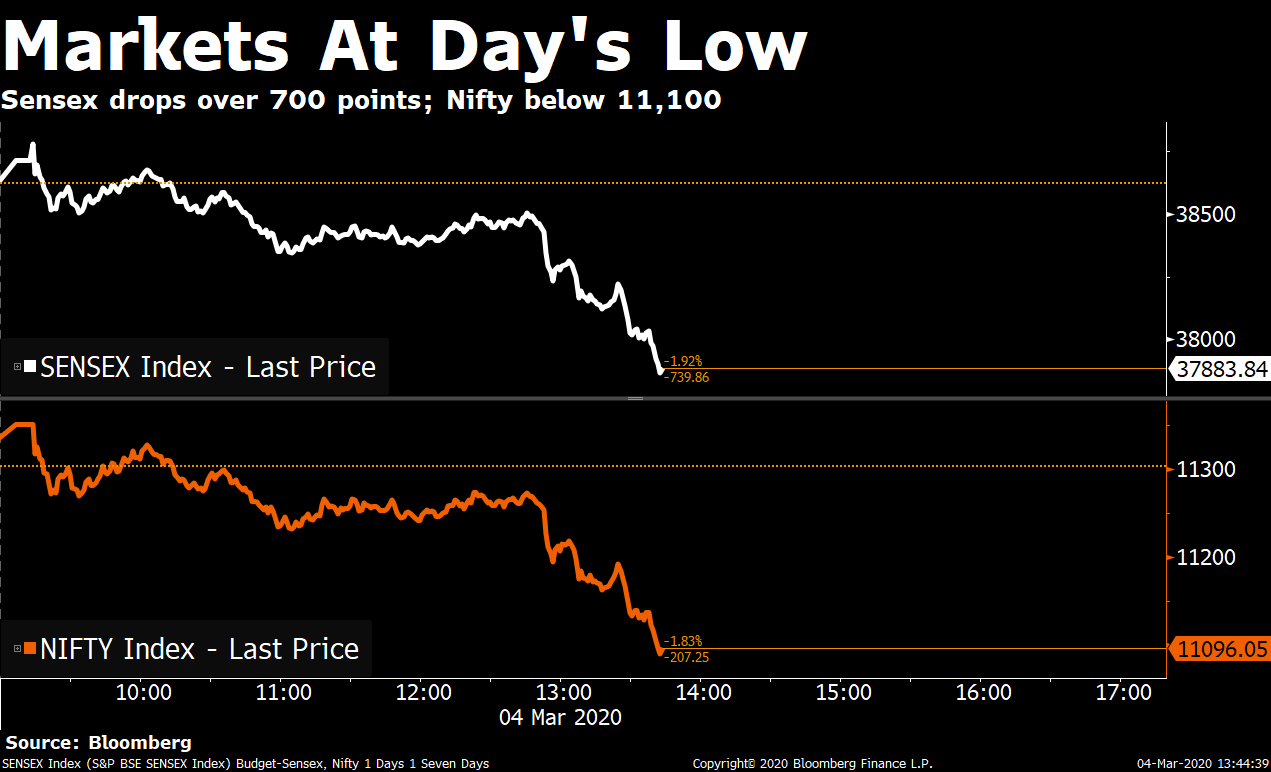The S&P BSE Sensex fell as much a 0.74 percent to 38,338.87 and the NSE Nifty 50 fell as much as 0.66 percent to 11,229. The broader markets represented by the NSE Nifty 500 Index fell as much as 0.74 percent.