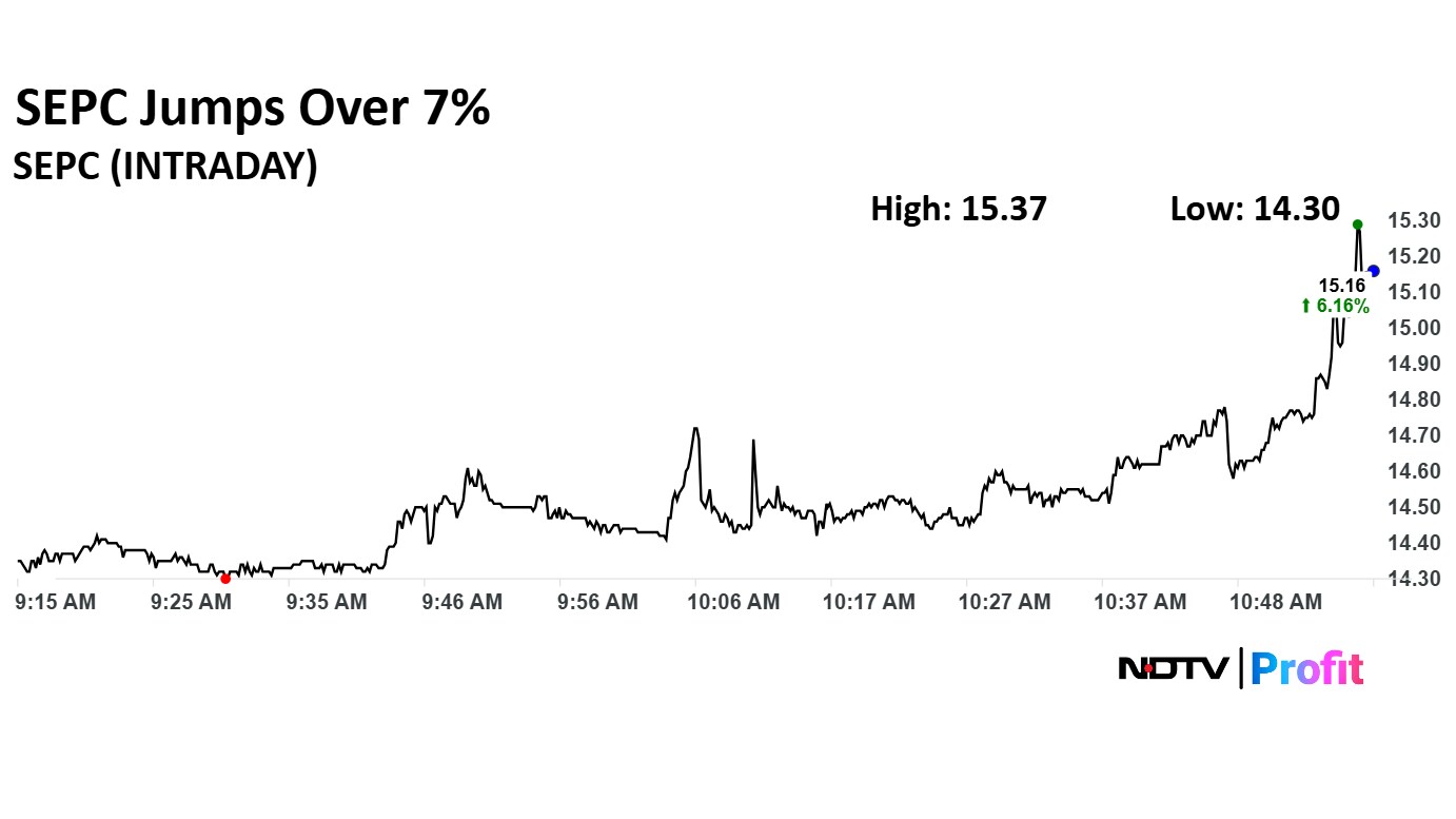 Following the news of the subsidiary's order win, SEPC's share price surged 10.08% to Rs 15.37 apiece. It pared gains to trade 7.21% higher at Rs 15.31 apiece as of 11:12 a.m., as compared to 0.24% decline in the NSE Nifty 50.