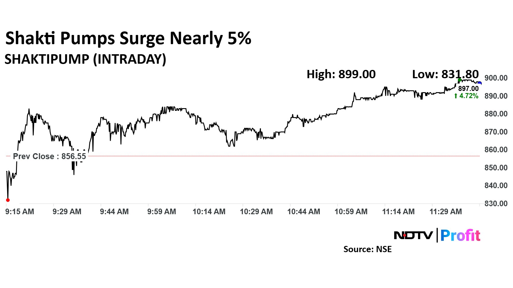 Share price of Shakti Pumps rose as much as 4.49% before paring some gains to trade 4.09% higher at Rs 891.60 apiece, as of 11:38 a.m. This compares to a 0.87% decline in the NSE Nifty 50.