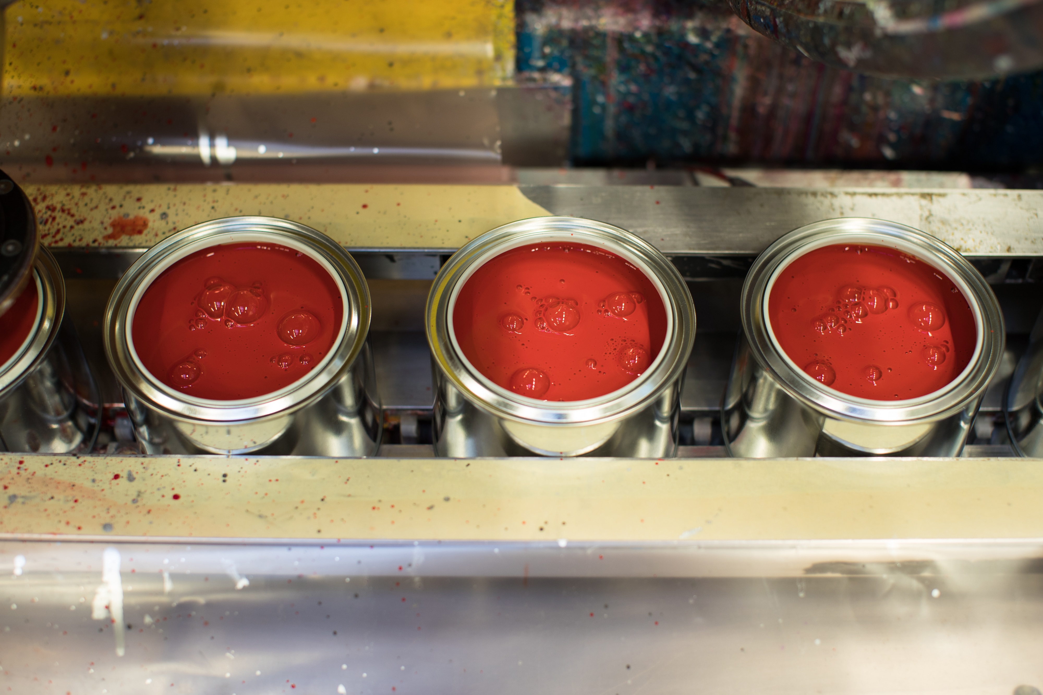 Open tins of red paint pass along the production line inside the Akzo Nobel NV paint and coatings factory in Sassenheim, Netherlands. (Photographer: Jasper Juinen/Bloomberg)