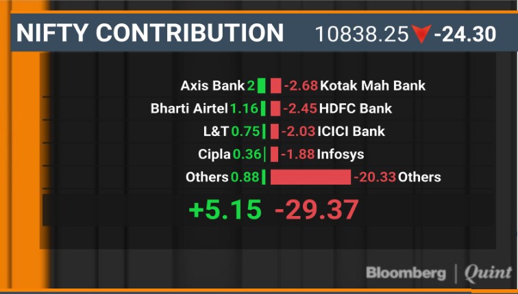The Sensex rose as much as 335 points from intraday low levels while Nifty touched high of 10,885.30 and low of 10,807.10.