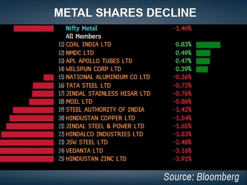• The NSE Nifty Metal Index was the top sectoral loser, down 1.5 percent.
