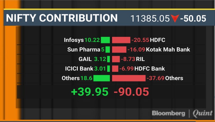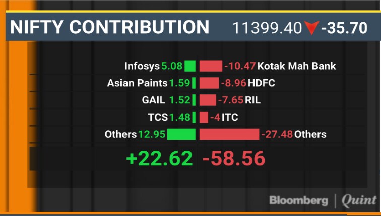 • The S&P BSE Sensex Index traded 0.1 percent lower at 37,811 and the NSE Nifty Index traded at 11,425, down 0.08 percent.