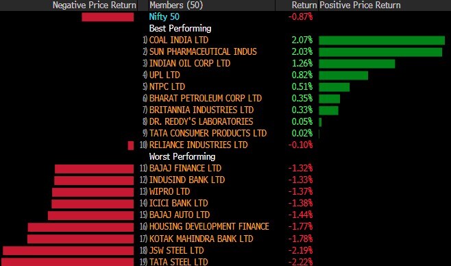 The S&P BSE Sensex dropped 0.7% to 49,161.81, while the NSE Nifty 50 Index declined 0.6% to 14,850.75. Housing Development Finance Corp. contributed the most to the index decline, decreasing 2.7%. JSW Steel Ltd. had the largest drop, falling 3.2%.