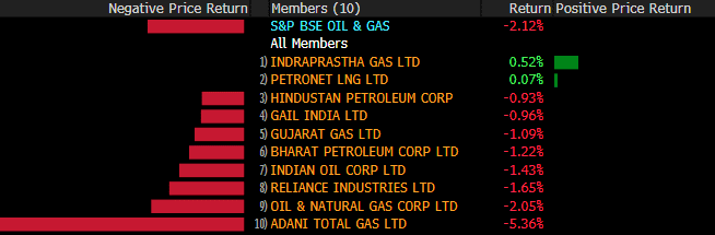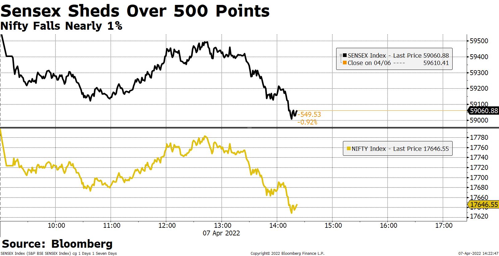 The broader indices outperformed their larger peers. The S&P BSE MidCap fell 0.4% and S&P BSE SmallCap lost 0.75%. Fifteen of the 19 sectoral indices compiled by BSE Ltd. declined, with S&P BS Energy, S&P BSE Oil & Gas shedding over 2%.