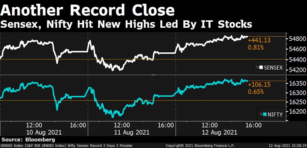 India’s stock benchmarks closed at record, led by the gains in power, utilities, technology and banking stocks. Small and midcap stocks rebounded after the weakness in previous session. Focus shifts to macroeconomic data as investors eyed July retail inflation and June industrial production data, due later in the day, to gauge the extent and trajectory of economic recovery.
