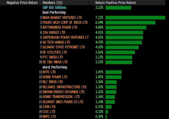 India's major stock benchmarks are set for a record close with broad-based gains. Barring S&P BSE Energy, all the other sectors advanced with S&P BSE Utilities gaining over 3%. All the constituents of the Utilities index rose with Nava Bharat Ventures and Power Grid Corporation adding the most.