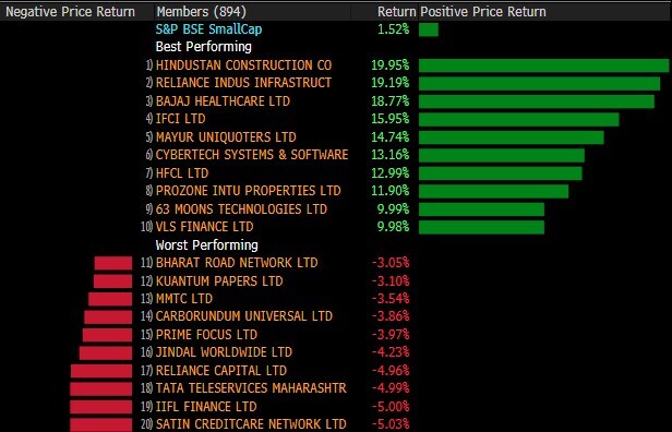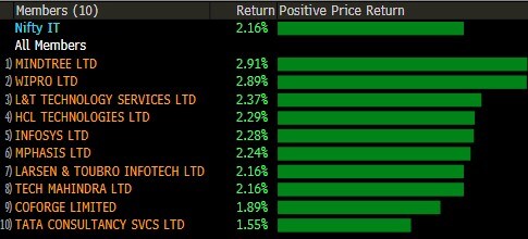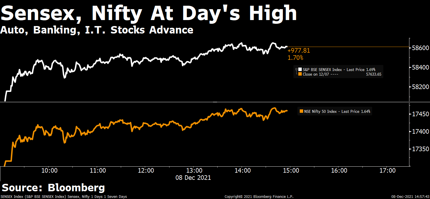 The broader indices almost mirrored their larger peers with the S&P BSE MidCap adding 1.2% and S&P BSE SmallCap rising 1.5%. All the 19 sectoral indices compiled by the BSE Ltd. advanced with S&P BSE Information Technology adding nearly 2%.