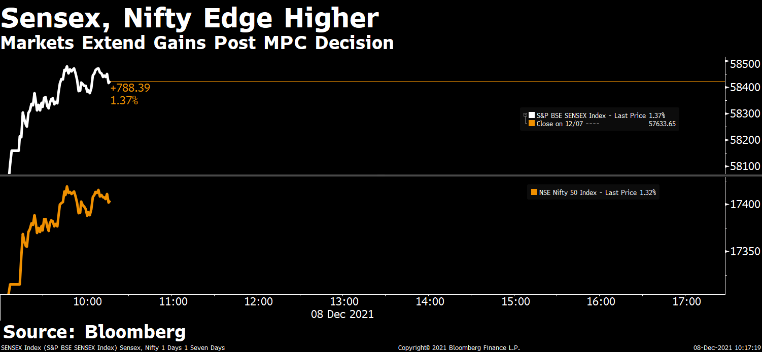 Indian bonds gain as traders read the central bank's decision to leave key rates unchanged as dovish. The rupee edged lower.