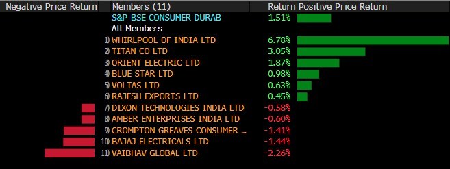 The broader indexes outperformed their larger peers with the S&P BSE MidCap adding over 0.75% and the S&P BSE SmallCap index gaining 0.5%. Sixteen of the 19 sectoral indexes compiled by BSE Ltd. advanced, with the S&P BSE Consumer Durables index rising over 2%.