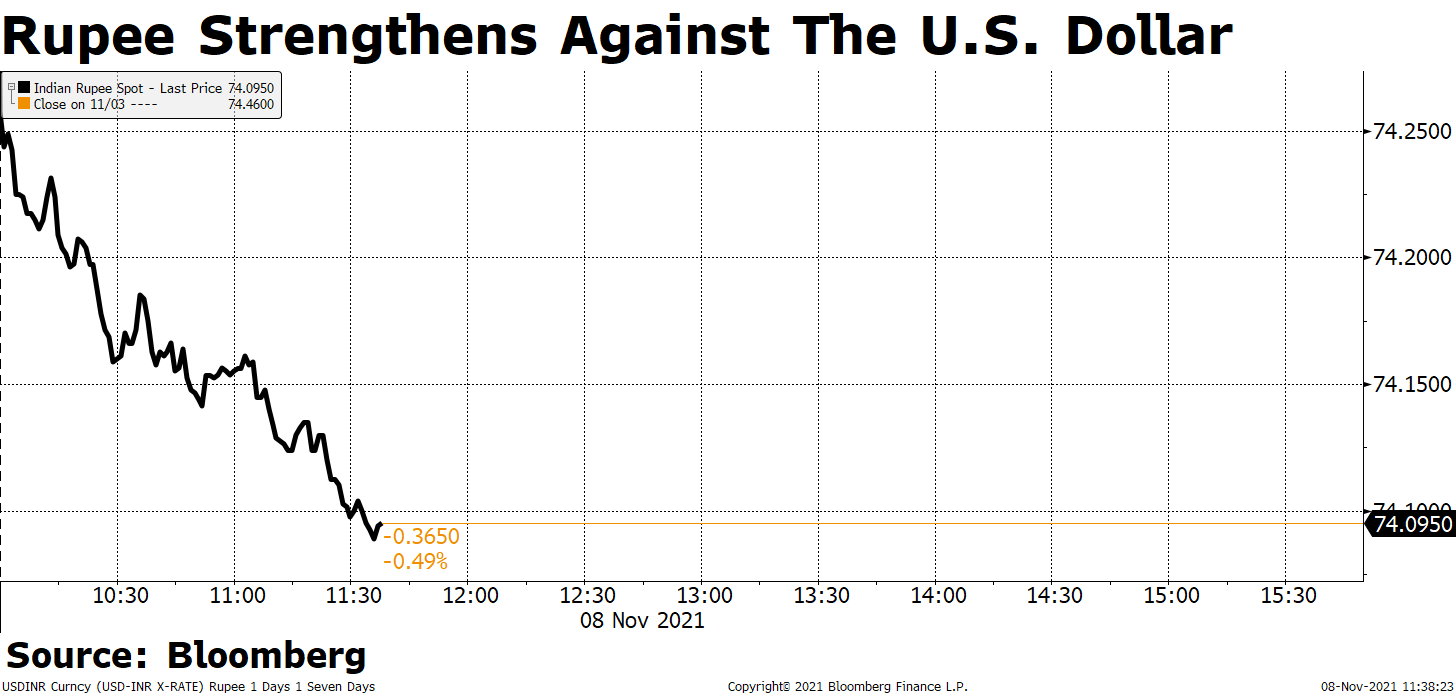 USD/INR dropped 0.4% to 74.1837