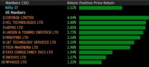 The market breadth was skewed in the favour of bulls. About 2,486 stocks advanced, 751 declined and 97 remained unchanged.