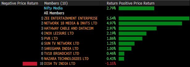 Shares of Zee Entertainment Enterprises Ltd. rose as much as 5.70%, the biggest intraday gain in nearly a month, to Rs 350.4 apiece. The 90-day exclusivity period to conduct due diligence for the merger with Sony ended today.