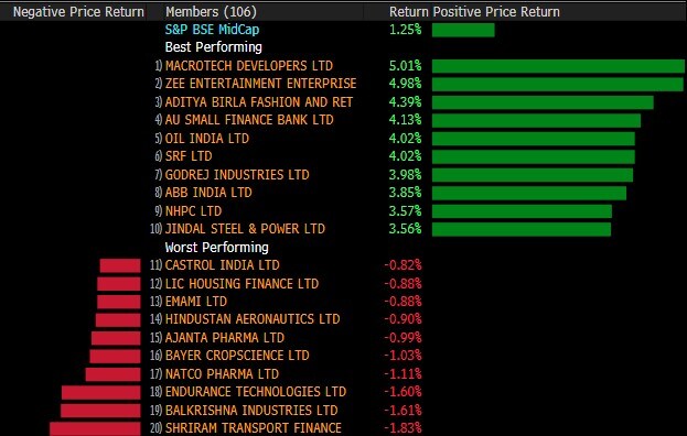 The broader indices outperformed their larger peers with S&P BSE MidCap and S&P BSE SmallCap adding over 1.25%. All the 19 sectoral indices compiled by BSE Ltd. advanced with S&P BSE Metal adding 3%. S&P BSE Consumer Durables and S&P BSE Basic Materials gained over 2%.