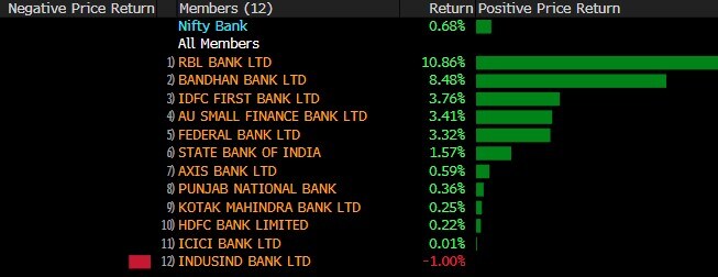 The market breadth was skewed in favour of bulls. About 1,952 stocks advanced, 1,301 declined and 148 remained unchanged.