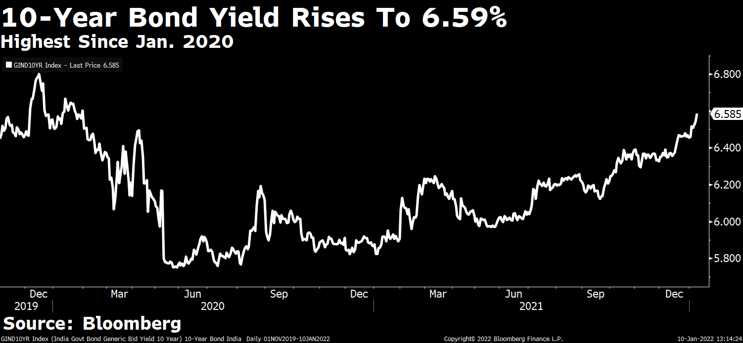 10-year yields rose 3bps to 6.57%, highest since January 2020; climbed 9 bps last week, most in six months.