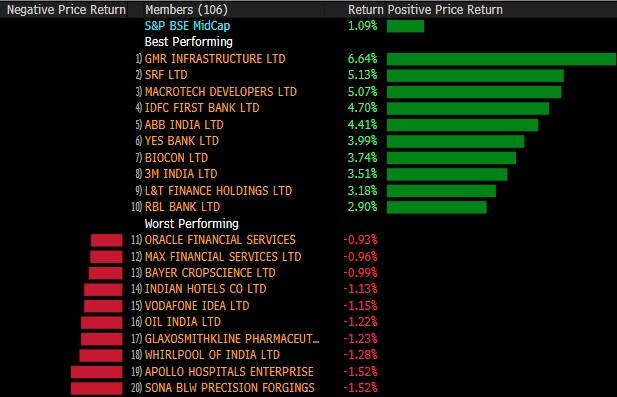 The broader indices outperformed their larger peers with S&P BSE MidCap and S&P BSE SmallCap rising over 1.3%. All the 19 sectors compiled by BSE Ltd. rose, with S&P BSE Realty advancing nearly 3%.
