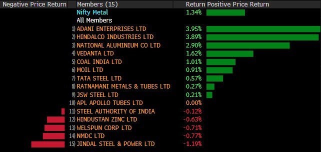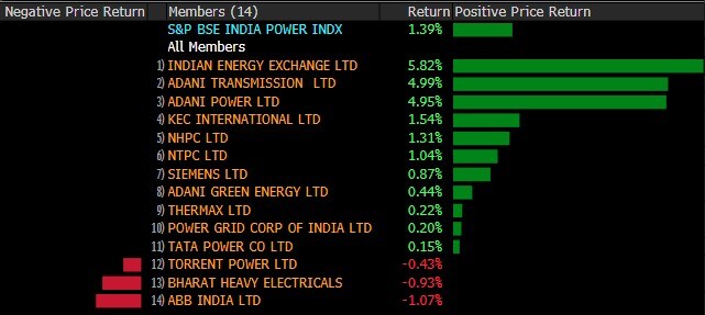 Power stocks rose with S&P BSE Power Index adding nearly 1.5%. Shares of Indian Energy Exchange Ltd. advanced nearly 6% while Adani Transmission Ltd. and Adani Power Ltd. added 5%. Only three out of the 14 constituents of the index declined with ABB India Ltd. shedding over 1%