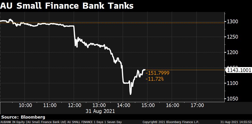 Shares of AU Small Finance Bank Ltd. declined 10%, the most in nearly 5 months, to Rs 1,164.70 apiece. CNBC-TV18 reported, quoting sources, that Sumit Dhir, Head Internal Audit at Jaipur Head Office may have resigned.