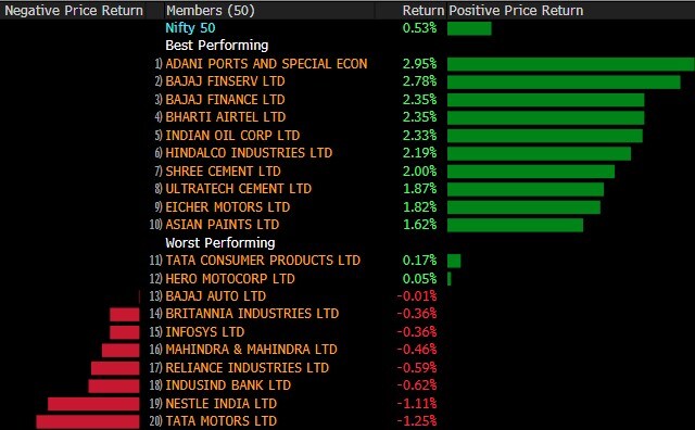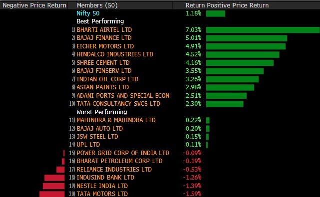 The S&P BSE Sensex advanced 1.16% to 57,552.39. The 30-stock index rose to a record 57,625.26 levels in intraday trade. The NSE Nifty 50 advanced by a similar magnitude to 17,132.20. The 50-stock index crossed 17,000 for the first time ever and hit a record 17,153.50 in intraday trade. Bharti Airtel Ltd. contributed the most to the index gain and had the largest move, increasing 7.0%. Today, 44 of 50 shares rose, while 6 fell.