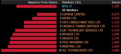 The broader indices outperformed their larger peers with the S&P BSE MidCap shedding 0.3% and S&P BSE SmallCap losing 0.1%. Barring S&P BSE Telecom, Auto and Consumer Durables, all the other 16 sectoral indices compiled by BSE Ltd. declined with S&P BSE Information Technology falling nearly 2%.