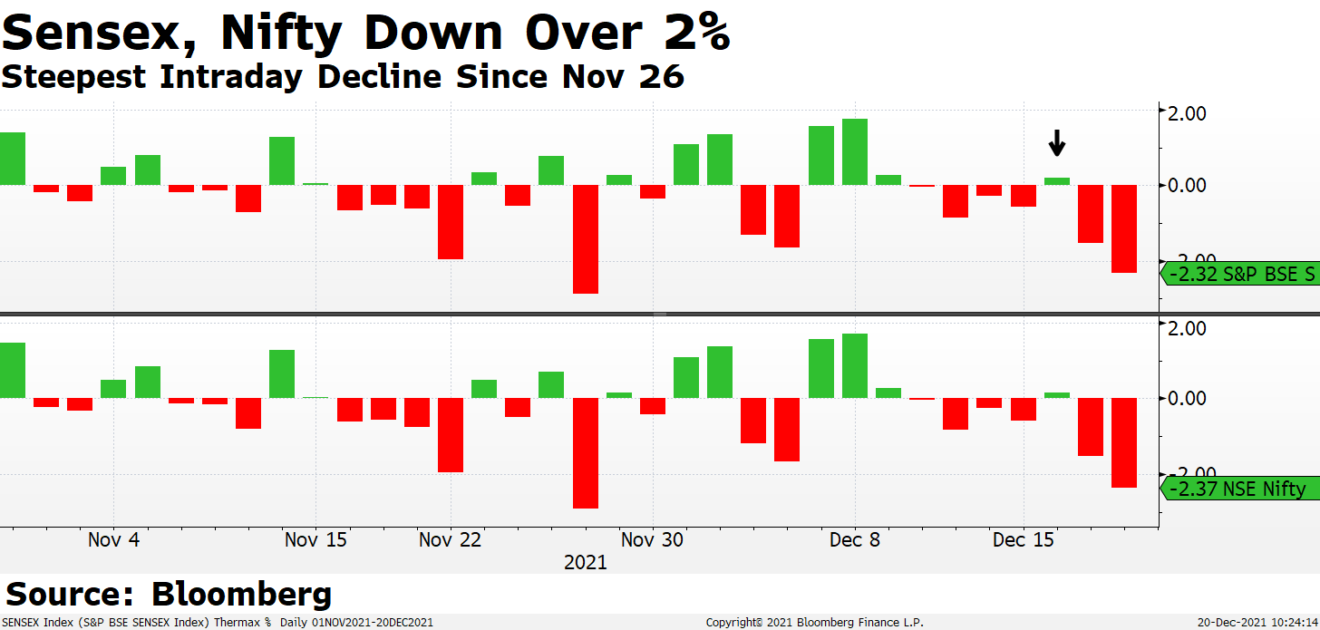 USD/INR falls 0.1% to 75.990; oil drops as much as 3.9% on Monday trading amid concerns that the omicron spread will hurt the global economy