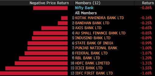 The market breadth was skewed in favour of bears. About 955 stocks advanced, 1,131 declined and 113 remained unchanged.