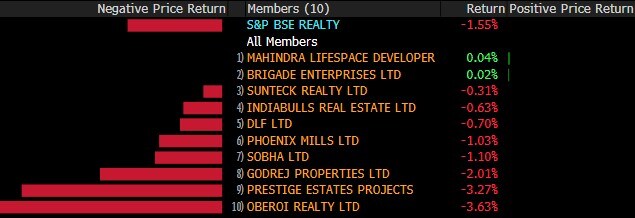 The broader indices outperformed their larger peers with the S&P BSE MidCap falling 0.1% and S&P BSE SmallCap rising nearly 0.5%. Eleven of the 19 sectoral indexes compiled by BSE Ltd. declined, with the S&P BSE Realty shedding over 1.5%