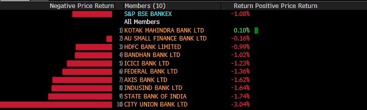 The broader indices almost mirrored their larger peers with S&P BSE MidCap and S&P BSE SmallCap shedding 0.1%. Fifteen out of the 19 sectoral indices compiled by the BSE Ltd. declined, with S&P BSE Metals shedding nearly 2.5% and S&P BSE Bankex losing 1%.