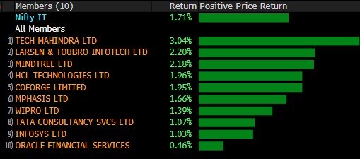 Tech stocks gained in trade with NSE Nifty IT adding nearly 2% to hit record 33,202.90. Tech Mahindra extended its rally and gained over 3% while L&T and Mindtree also advanced in excess of 2%. All the constituents in Nifty IT rose with shares of Tata Consultancy Services hitting a record as the company's market capitalisation surged past Rs 13 lk crore mark.