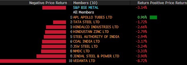 Metal stocks declined with S&P BSE Metal shedding over 3%. Vedanta Ltd.'s shares fell nearly 9% while Coal India, JSW Steel, NMDC, Jindal Steel & Power were down over 3%.