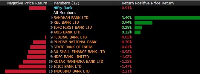 The broader indexes outperformed their broader peers with the S&P BSE MidCap index shedding 0.1% and the S&P BSE SmallCap gaining 0.3%. Fourteen of the 19 sectoral indexes compiled by BSE Ltd. declined, with the S&P BSE Bankex index losing 1%.