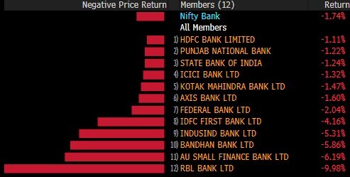 Shares of Bandhan Bank Ltd., IndusInd Bank Ltd, AU Small Finance Bank Ltd., IDFC First Bank Ltd. and Federal Bank Ltd. declined as sentiment was sapped following the RBI's intervention into RBL Bank Ltd.