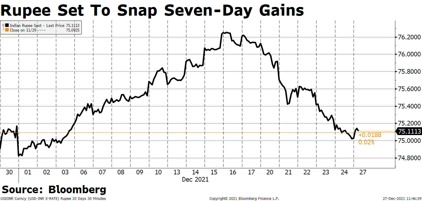 USD/INR fell 0.3% to 75.0188 on Friday, fell 1.4% last week, the most since August 2020.