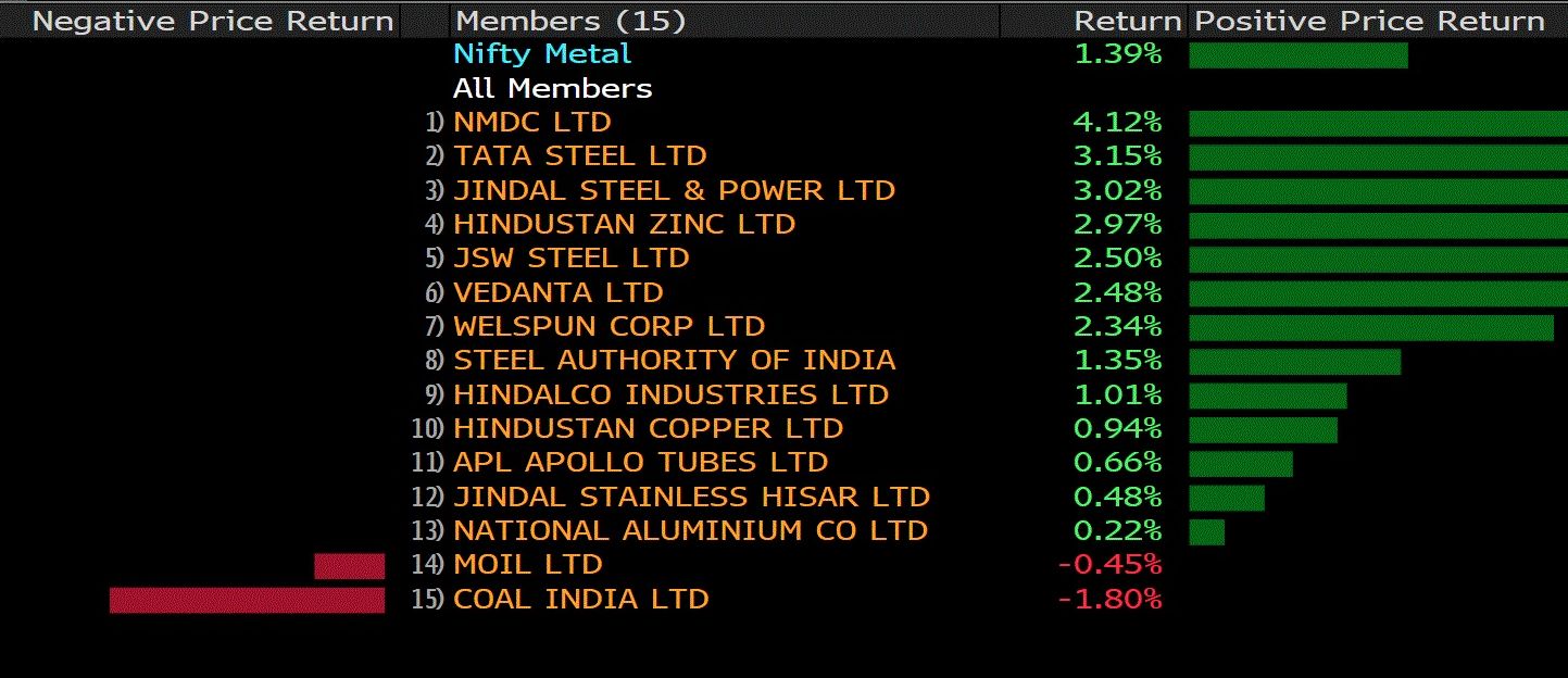 The NSE Nifty Metal Index rose 1.4 percent, led by the gains in NMDC Ltd. Tata Steel Ltd. and Jindal Steel & Power Ltd.
