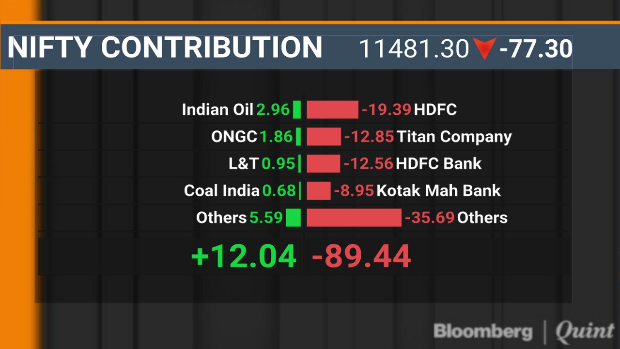 The S&P BSE Sensex fell nearly 200 points to 38,525 as of 11 a.m. and the NSE Nifty 50 traded around, 11,500, down 0.5 percent. The broader market index represented by the NSE Nifty 500 Index fell as much as 0.4 percent.