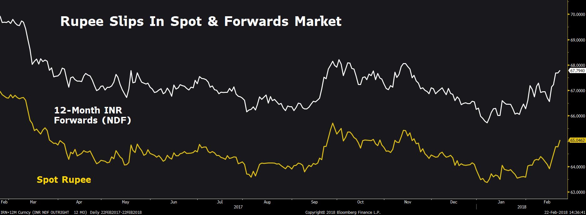 In the spot market, the Indian rupee has fallen 1.7 percent over the past five days - the most in Asia. The turn in direction has been reflected in the offshore non-deliverable forwards market as well. The 12-month non-deliverable forwards are trading close to 67.80 against the U.S. dollar.