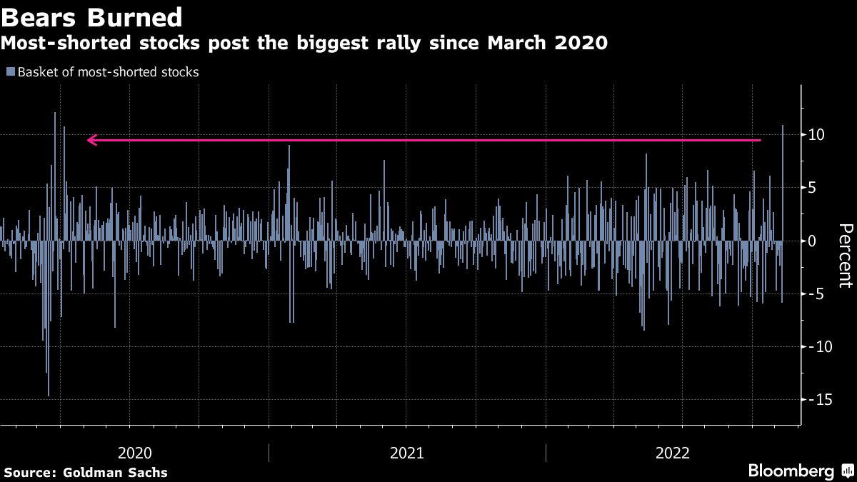 While short sellers have reaped gains during the bear market, any such bets were backfiring Thursday. A Goldman Sachs Group Inc. basket of the most-shorted stocks surged 11%, snapping an eight-day slide and punishing bears by the most since March 2020.