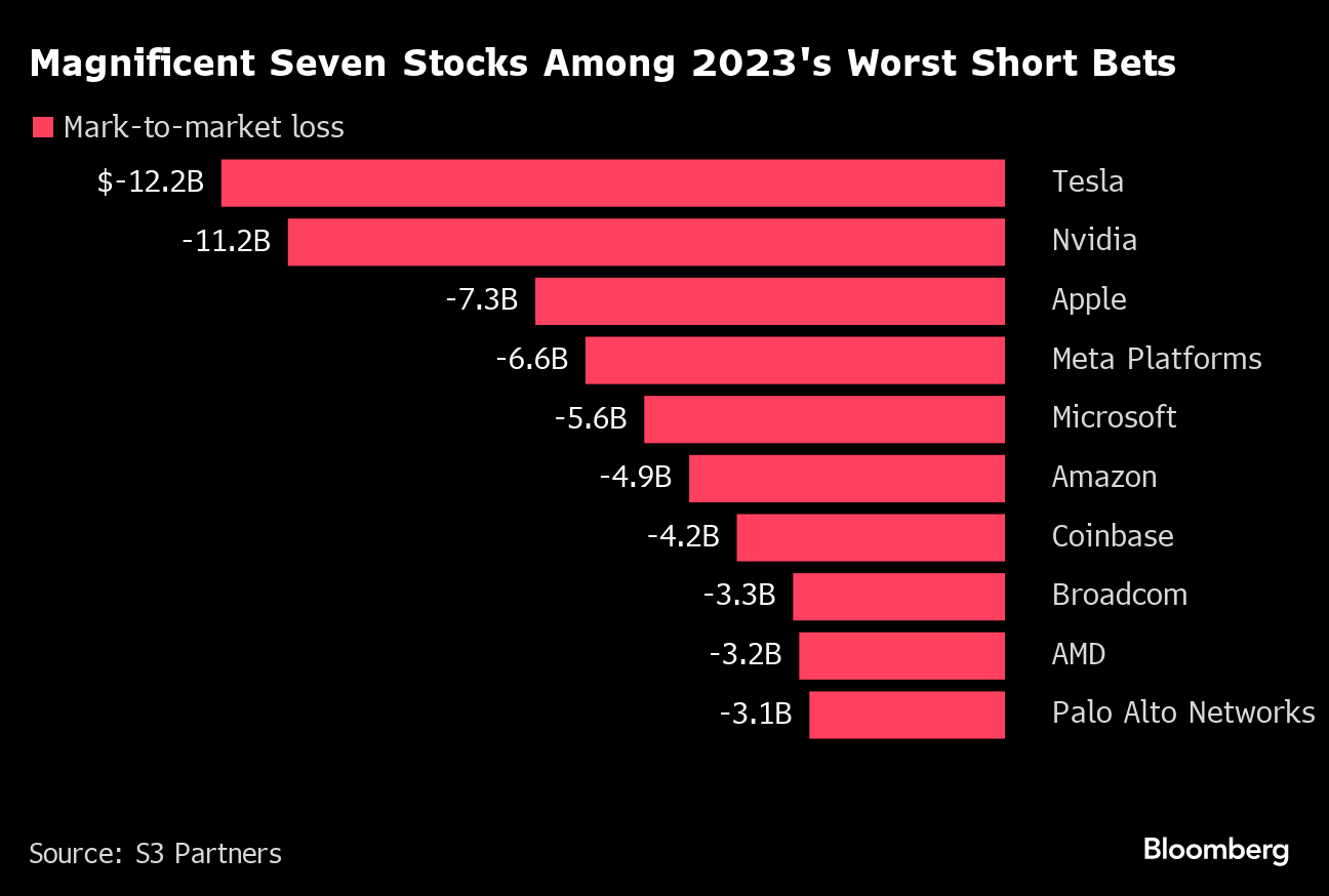 Tesla Inc. gave short sellers the most pain, with $12.2 billion in paper losses in 2023 as the stock of the electric-vehicle maker roughly doubled. Nvidia Corp, which lost contrarian traders $11.2 billion, was next on the list, which includes most of the so-called Magnificent Seven, semiconductor companies and also Coinbase Global Inc. as bitcoin rallied.