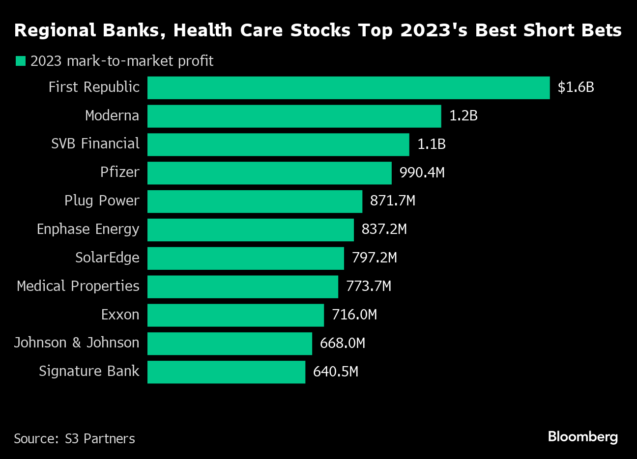 (Bloomberg) -- Regional banks and vaccine makers were among the few bright spots for short sellers in 2023, as the stock market's big rally last year delivered the group's steepest cumulative loss since the depths of the pandemic.