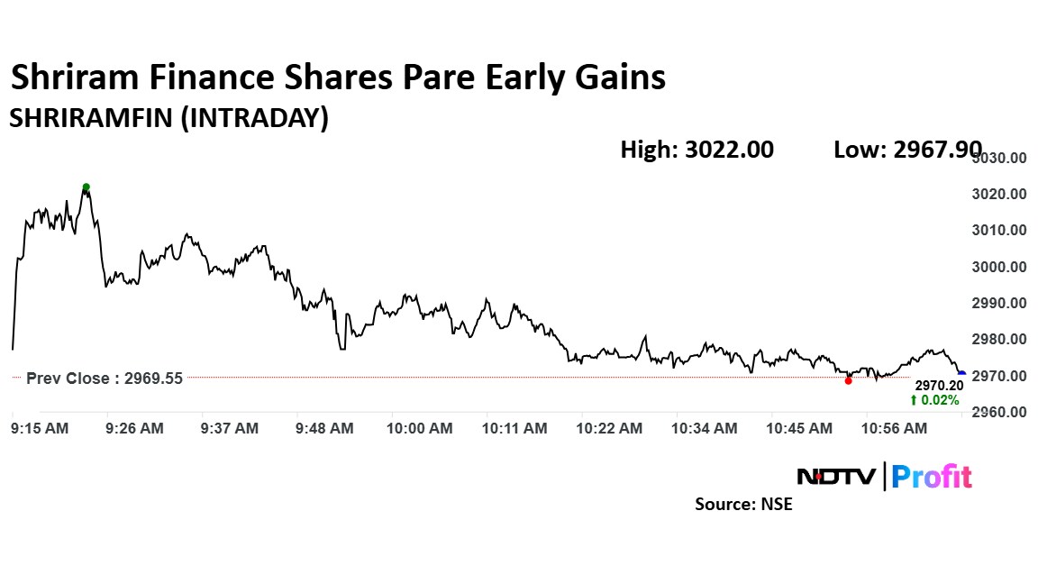 Shriram Finance's stock rose as much as 1.77% during the day to Rs 3,022 apiece on the NSE. It was trading 0.22% higher at Rs 2,976 apiece, compared to a 0.53% advance in the benchmark Nifty 50 as of 11:06 a.m.