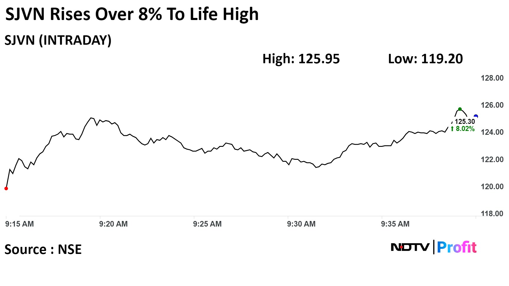 Shares of SJVN rose as much as 8.16% to Rs 125.95 apiece, the highest level since its listing on May 19, 2010. It was trading 7.17% higher at Rs 124.80 apiece as of 9:50 a.m. This compares to a 0.89% advance in the NSE Nifty 50 Index.