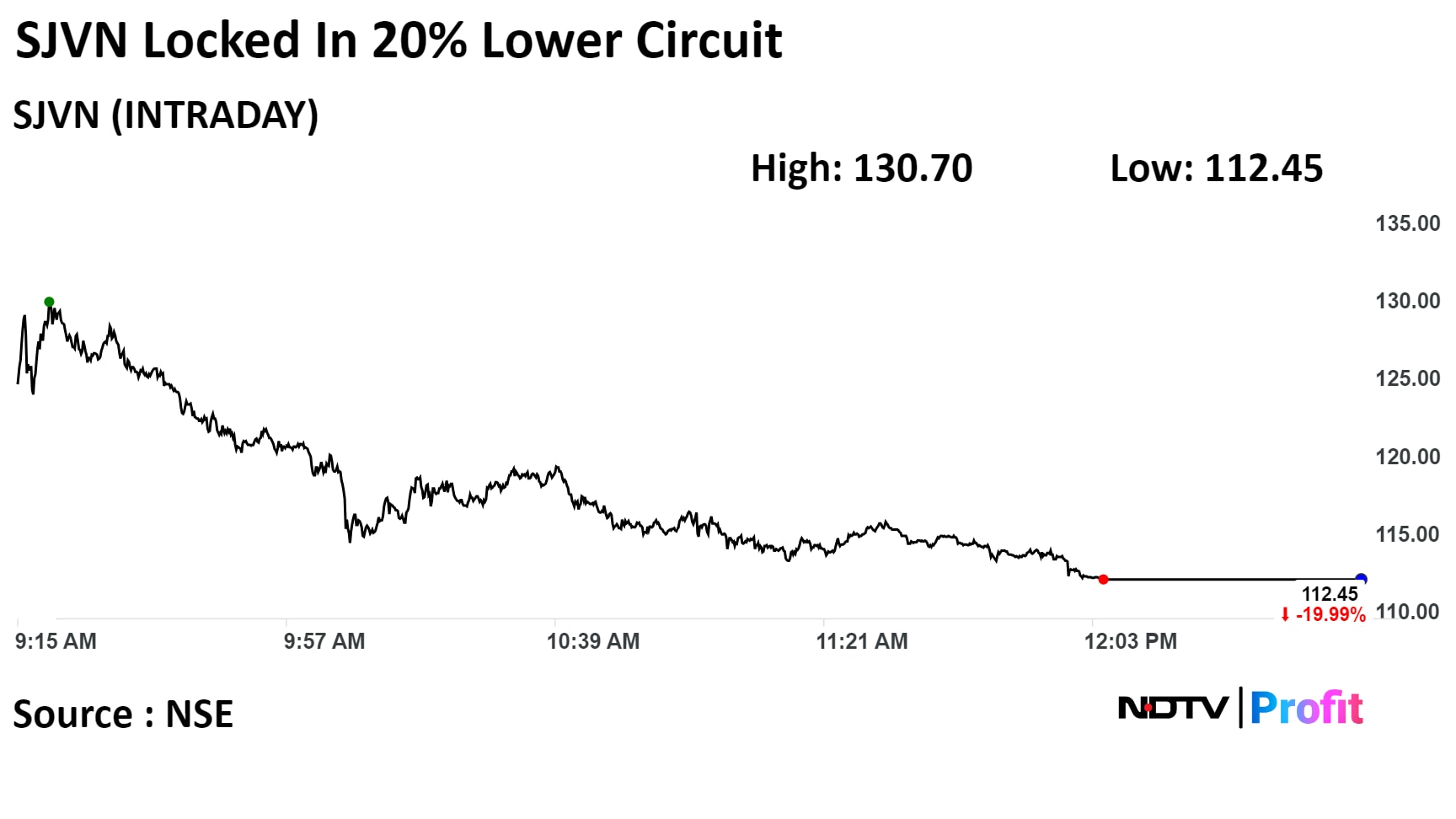 Shares of SJVN were locked in 20% lower circuit on NSE. It was trading at lower circuit of 20% at Rs 112.45, the lowest level since Jan. 25. This compares to 0.55% decline in the NSE Nifty 50.