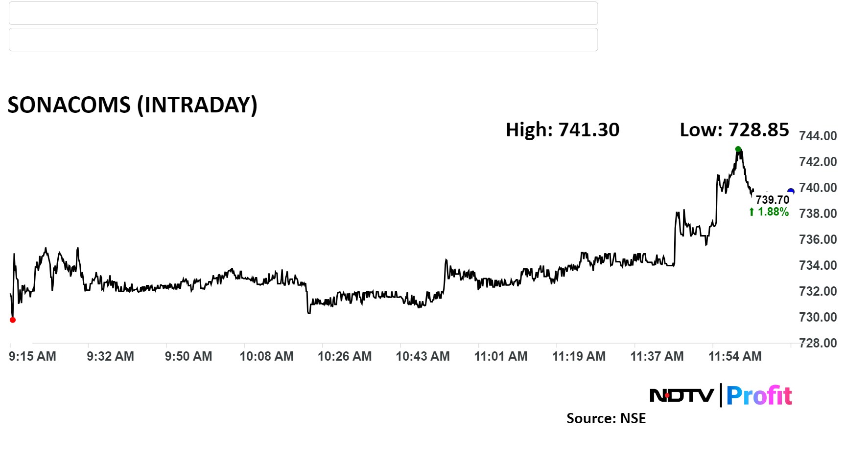 Shares of Sona BLW rose as much as 2.1% to Rs 741.3 apiece on the NSE. In comparison, the benchmark Nifty 50 was nearly flat at 12:17 p.m.