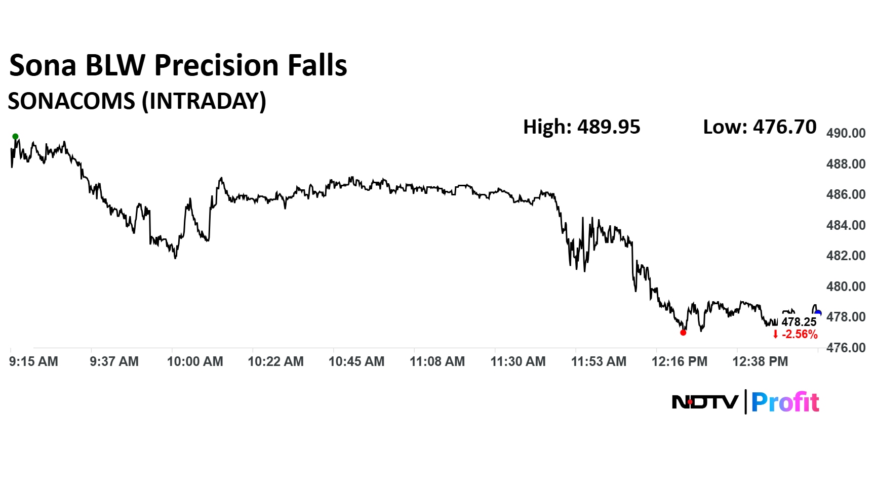 Sona BLW Precision Forgings share price fell 2.95% to Rs 476.70 apiece. It was trading 2.57% down at Rs 478.3 apiece as of 1:11 p.m., as compared to 0.82% decline in the NSE Nifty 50 index.