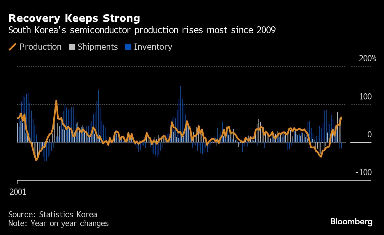 (Bloomberg) -- South Korea's output of semiconductors jumped the most in 14 years in February in an indication of ongoing recovery in the country's most important industrial sector and global tech demand.