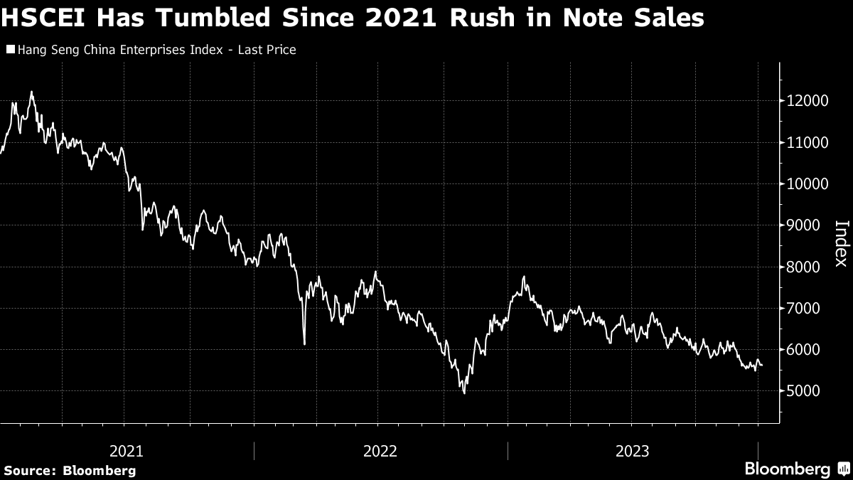 The notes in focus were mostly sold in 2021 when the HSCEI peaked above 12,000. The gauge is now trading at less than half that level.