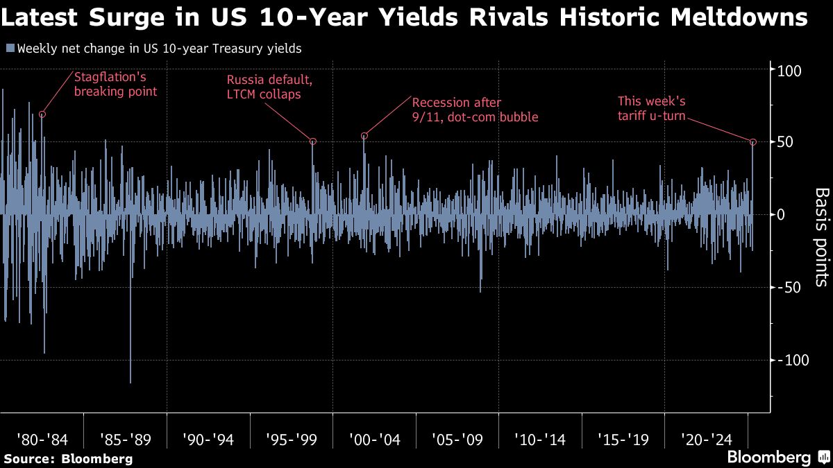 Volatility shows little signs of easing as concerns that President Donald Trump's fast-evolving trade policy is not only shaking the global economy, but threatening the US status as the world's safe haven. The S&P 500 jumped 1.8% on a report that a Federal Reserve official said the central bank is ready to help stabilise markets, if needed. US 10-year yields came well off Friday's highs, but saw their biggest weekly surge in over two decades.