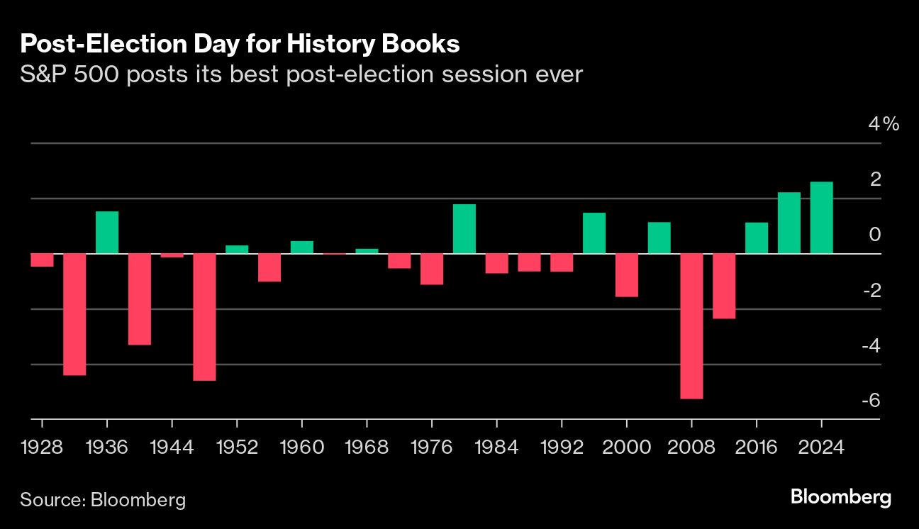 The S&P 500 climbed 2.5% on bets the newly elected president will enact pro-growth policies that will boost Corporate America. The benchmark had its best post-Election Day in history, according to data compiled by Birinyi Associates Inc. and Bloomberg.