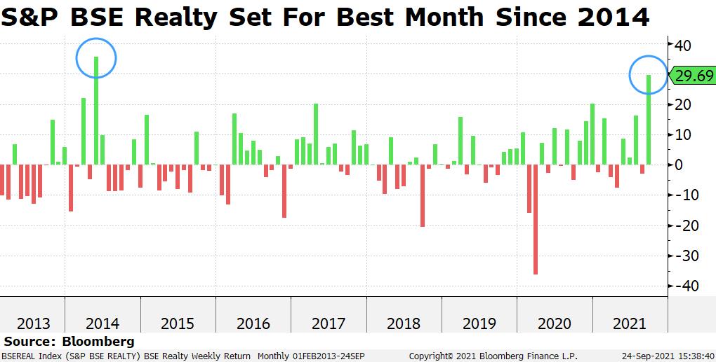 The 10-stock index advanced nearly 21.3% in the week, surpassing all weekly gains made across the 88 months since May 25, 2014, when the gauge rose 23.13%. The S&P BSE Realty index has gained nearly 30% in the month so far, on track to log its best monthly gains since May 2014 as well.